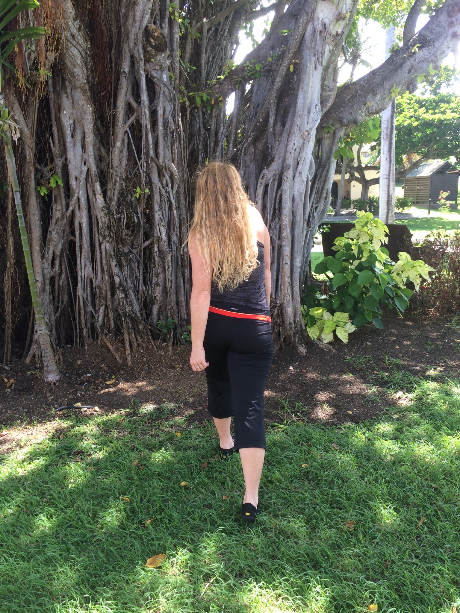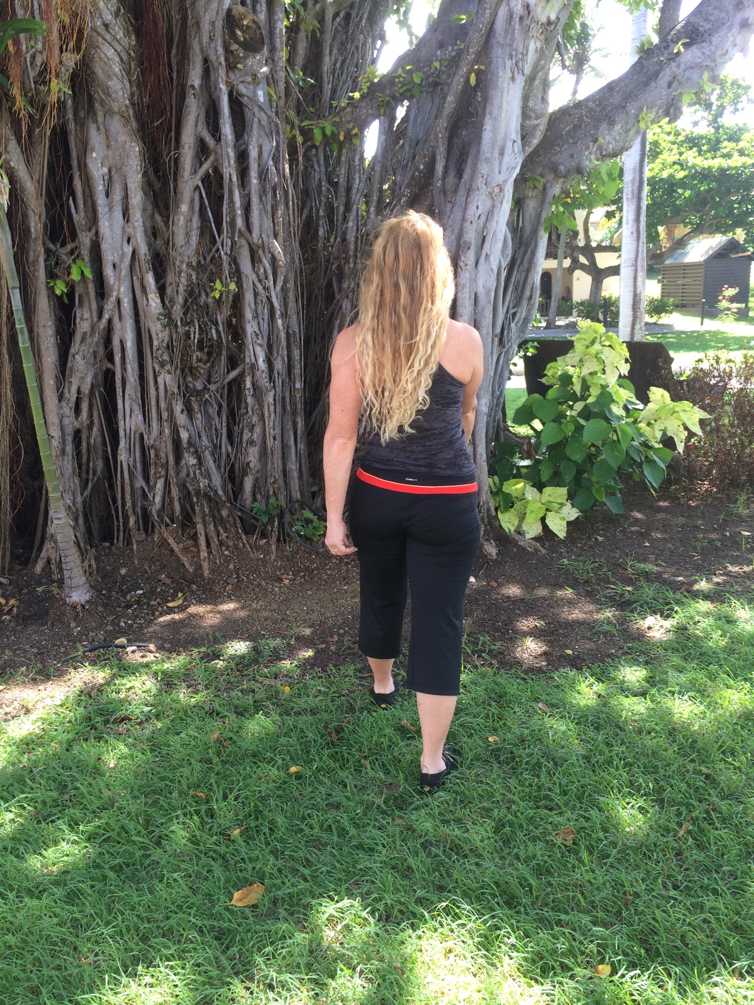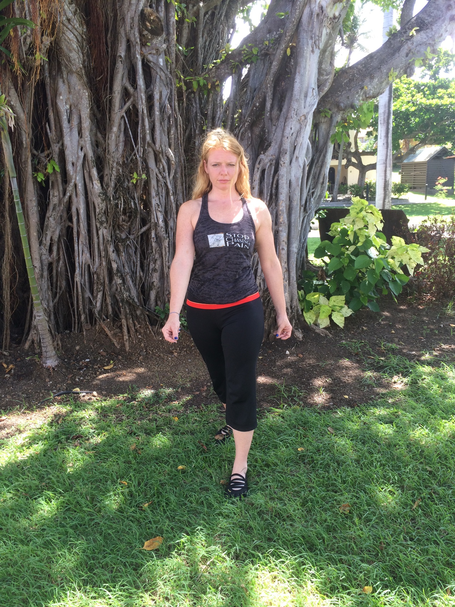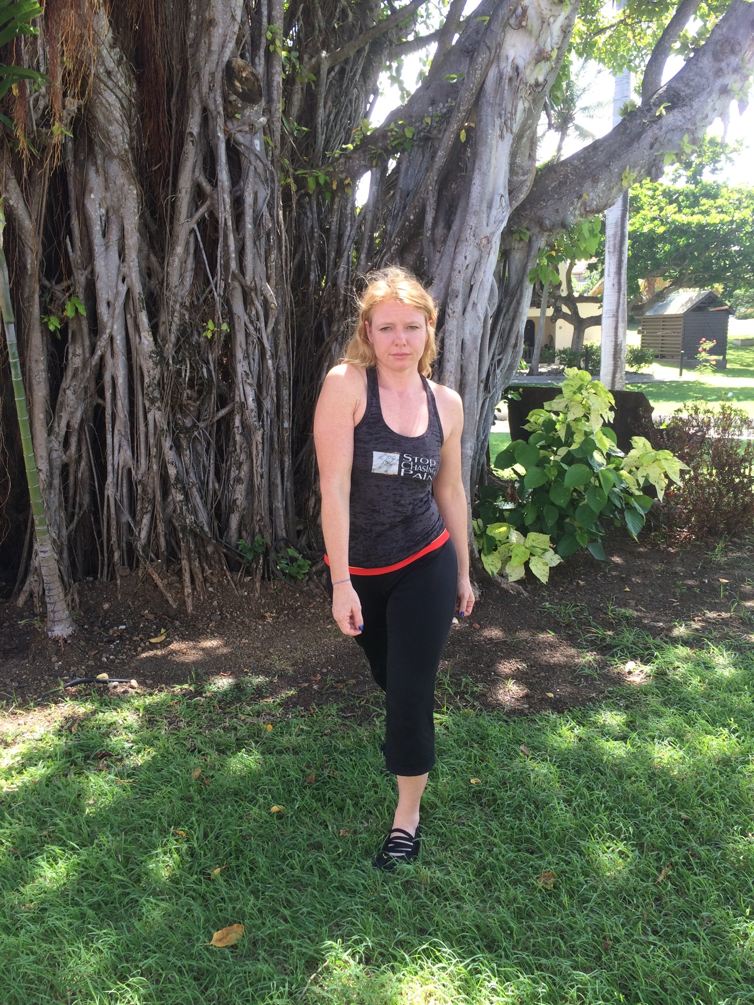 You can see my right shoulder is hiking, and my left side sacrum is jamming into my left ilium, as the shirt wrinkles above my buttock.