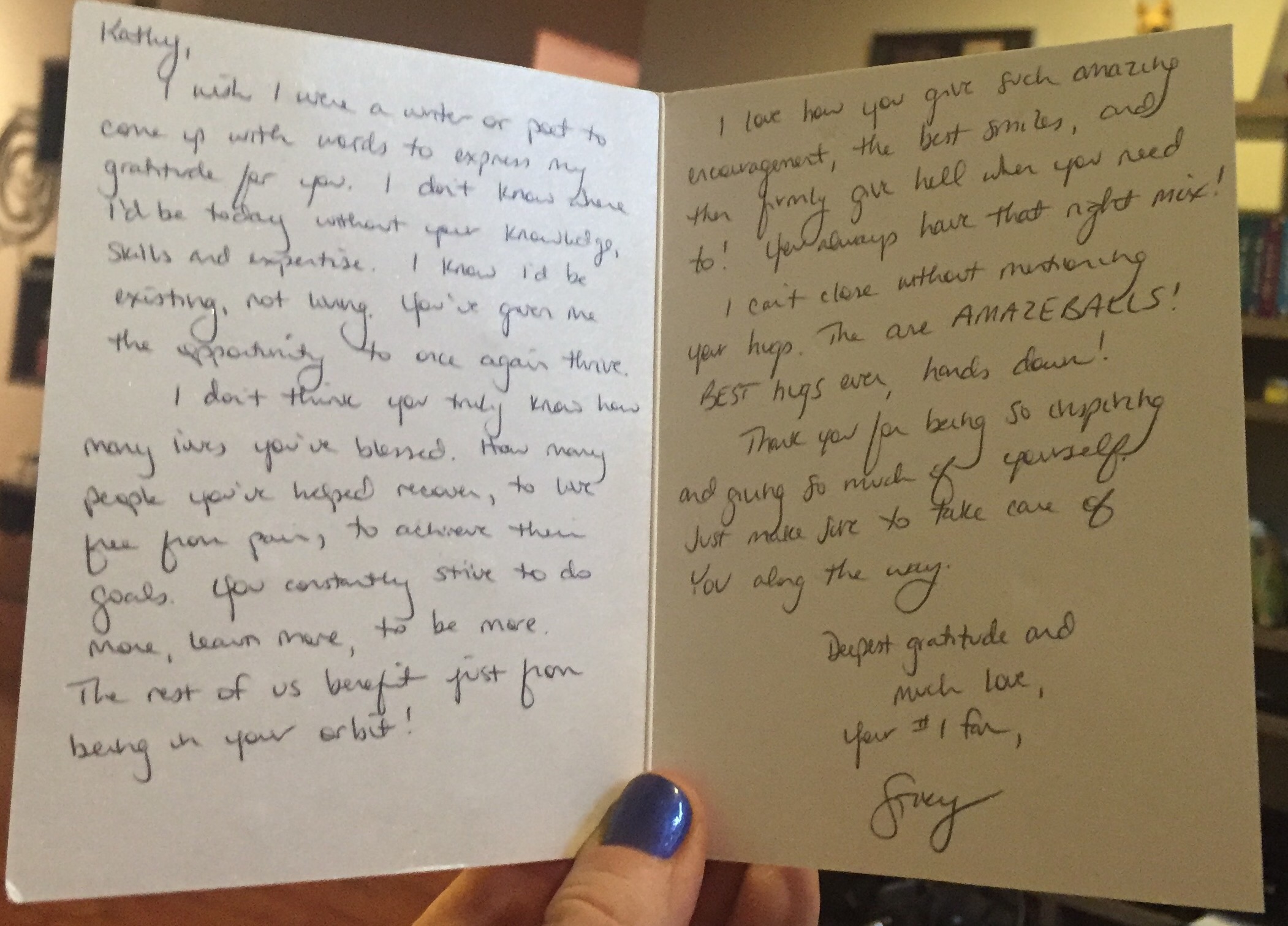 But before I could get to that, I opened a thank-you card from my Skype client, Stacy Hennis, in California.
