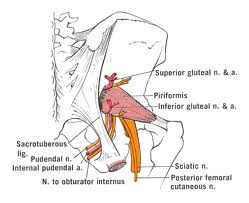 The pudendal nerve covers a treacherous path, from the inside of the true pelvis out into the gluteal areas via the greater sciatic foramen. On its pathway out of the true pelvis, the nerve is wedged between two pelvic floor supporters: the piriformis and coccygeus muscles.